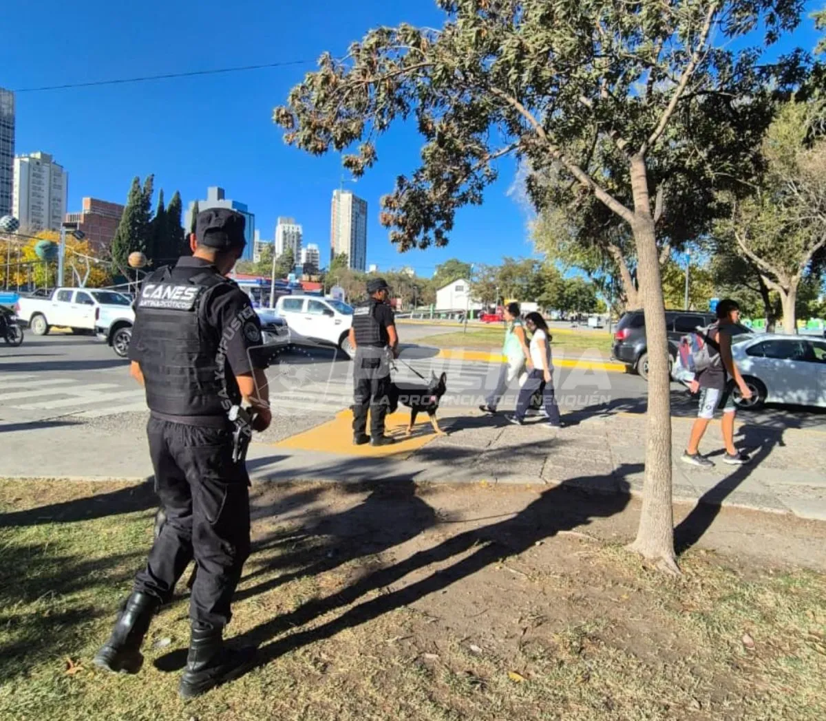 Un operativo preventivo del Departamento Antinarcóticos se desarrolló en el Parque Central de la ciudad de Neuquén, donde se realizaron controles con la intervención de perros entrenados para la detección de estupefacientes.