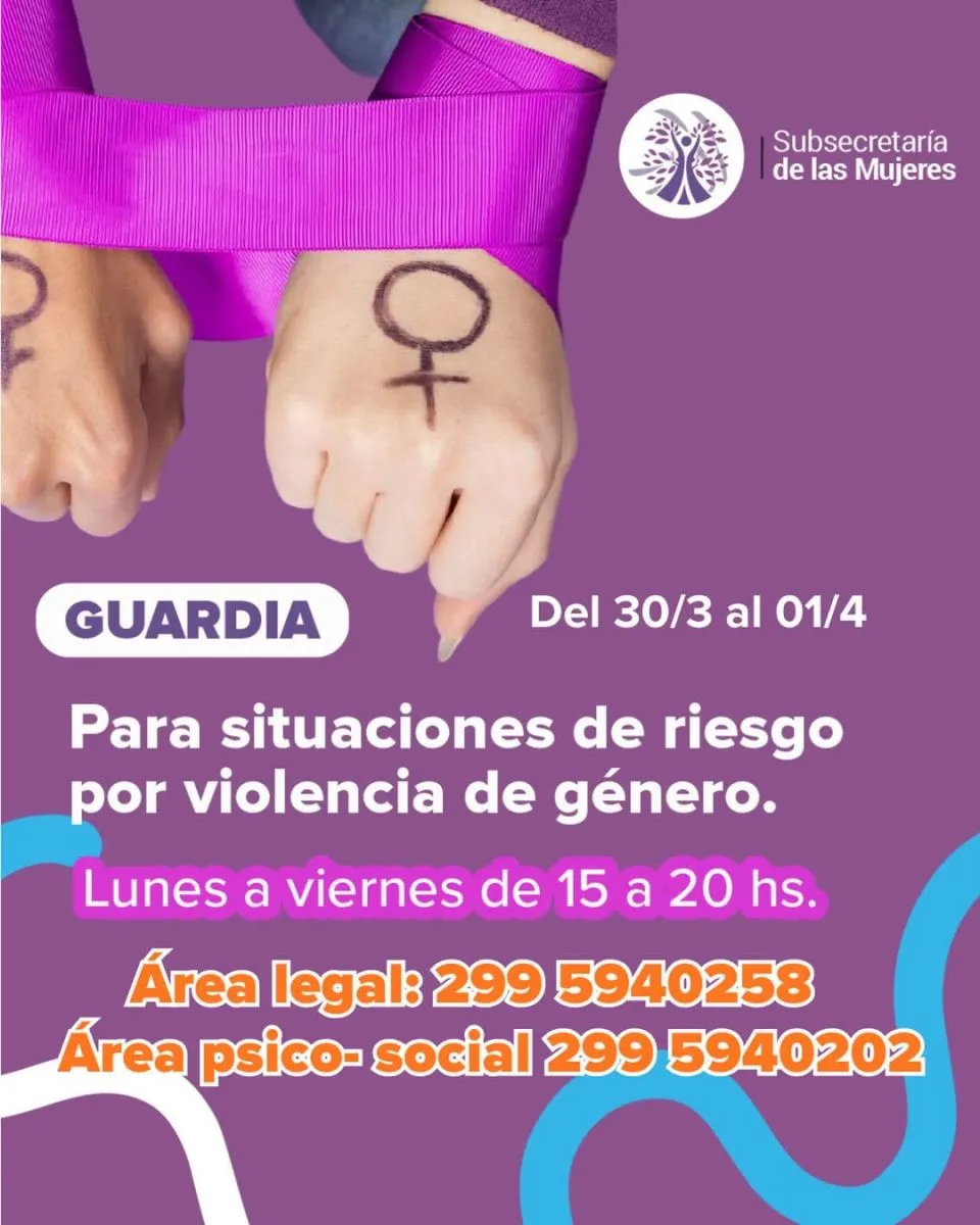 El jueves 2 de abril la atención será de 10 a 13, con contacto en el área legal al 299 5940203 y en el área psicosocial al 299 5940216. En tanto, el viernes 3, en el mismo horario, estarán disponibles los teléfonos 299 5121506 (área legal) y 299 5940254 (área psicosocial).