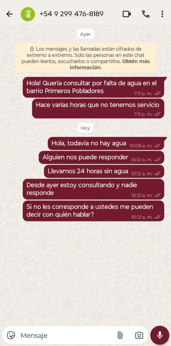 De acuerdo con los testimonios, los vecinos realizaron múltiples gestiones para obtener información. En primer lugar, se comunicaron con el Ente Provincial de Agua y Saneamiento (EPAS), desde donde les indicaron que debían canalizar el reclamo a través del Municipio de Centenario.