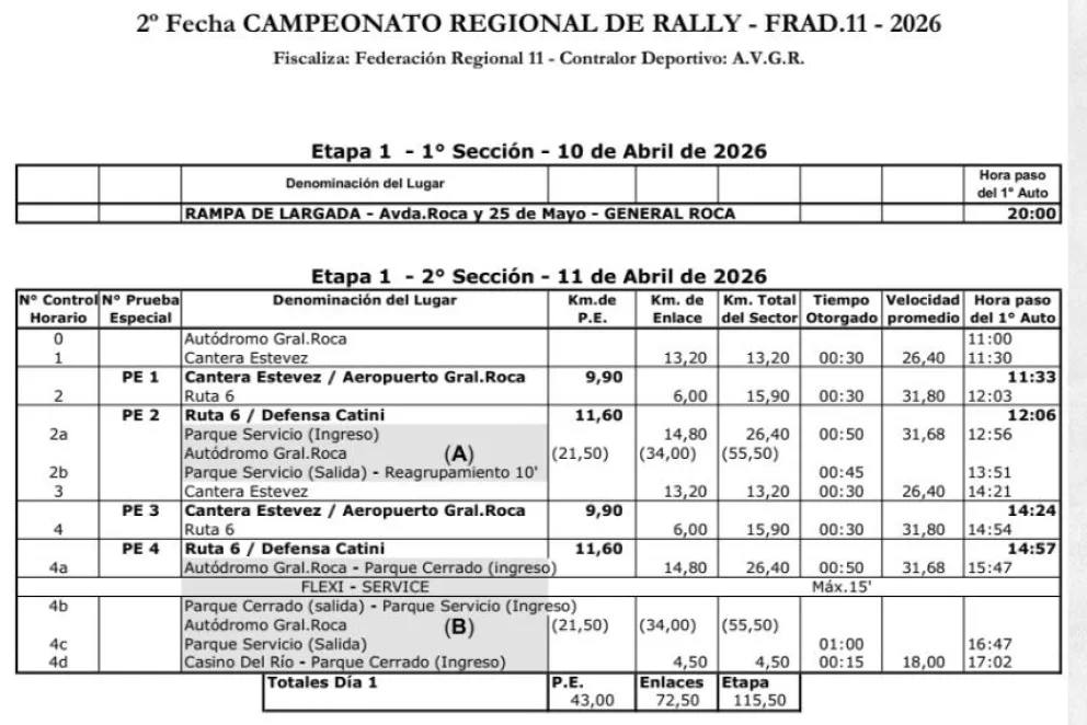 Todo se iniciará a las 11.33 con el parcial Cantera Estevez - Aeropuerto de General Roca, de 9,9 kilómetros. Luego se repetirá como PE3 a las 14.24.
