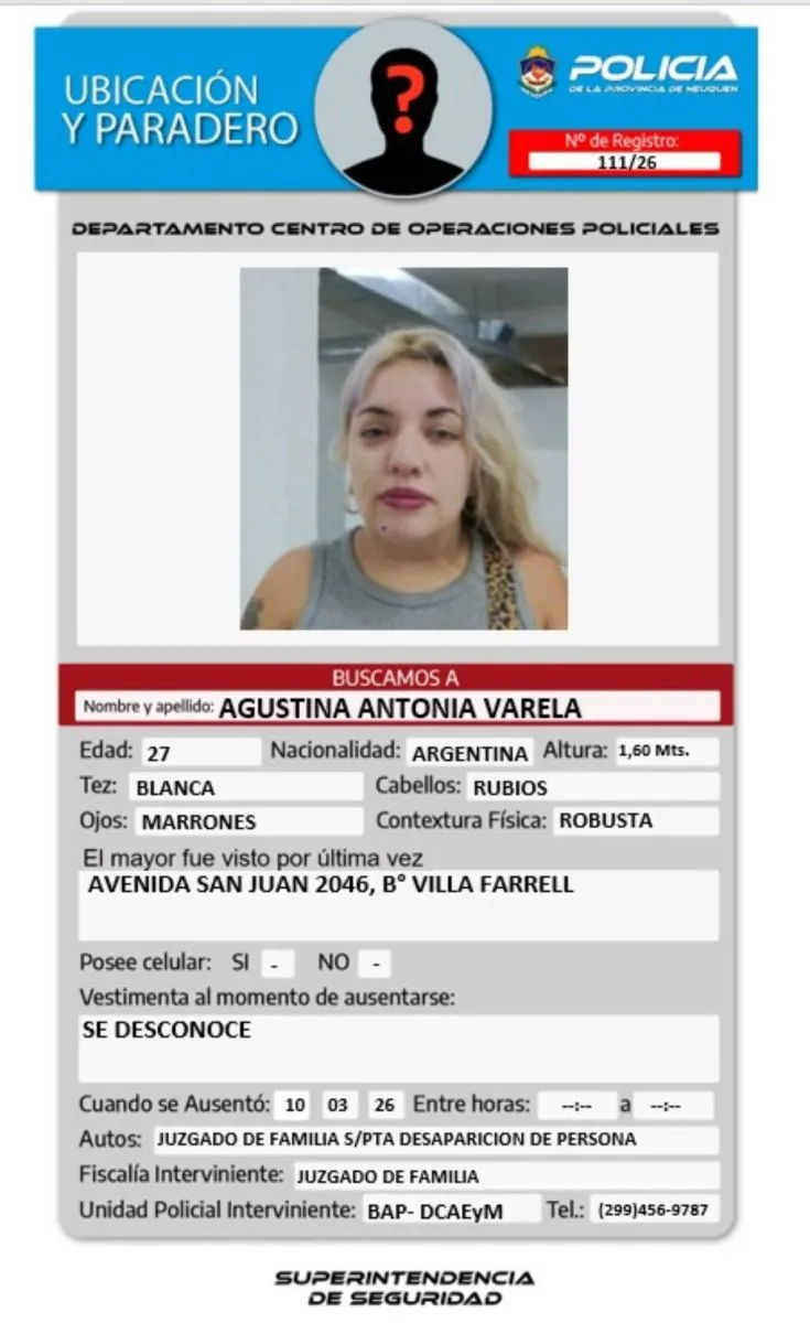 La Policía de Neuquén emitió un pedido de ubicación y paradero para dar con Agustina Antonia Varela, una mujer de 27 años cuyo rastro se perdió en la ciudad capital, generando preocupación entre sus familiares y allegados.