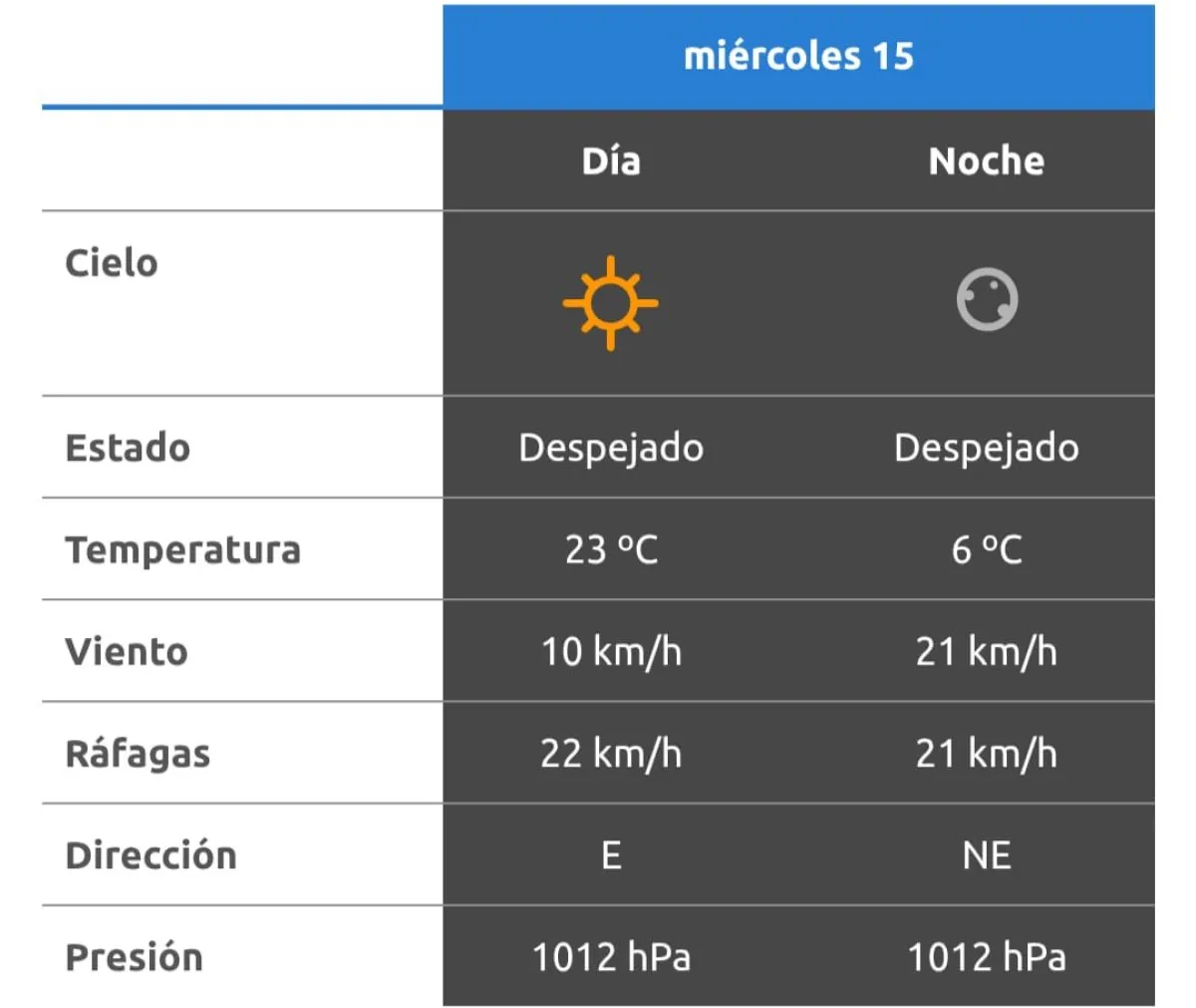 El cielo se mantendrá despejado tanto durante el día como en horas de la noche, lo que permitirá disfrutar de una jornada ideal para actividades al aire libre, sin probabilidad de precipitaciones. La mejora en las condiciones responde al ingreso de aire más estable tras el frente frío que afectó la región en las últimas horas.