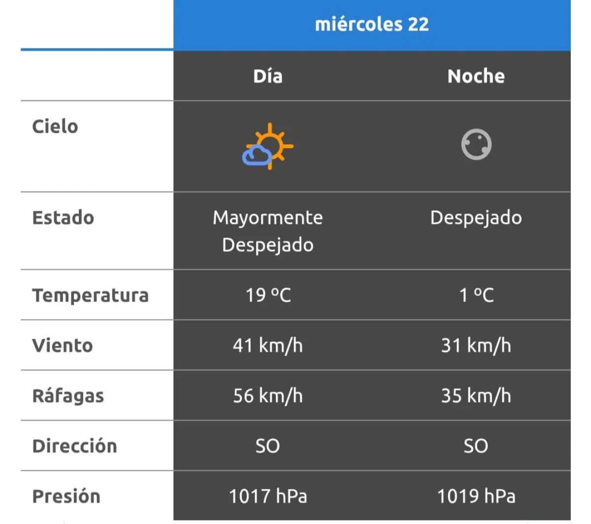 Uno de los datos más relevantes del pronóstico es la intensidad del viento. Durante el día, se prevén velocidades de alrededor de 41 km/h, con ráfagas que podrían alcanzar los 56 km/h. Por la noche, si bien disminuirá levemente, el viento continuará presente con valores cercanos a los 31 km/h y ráfagas de hasta 35 km/h.