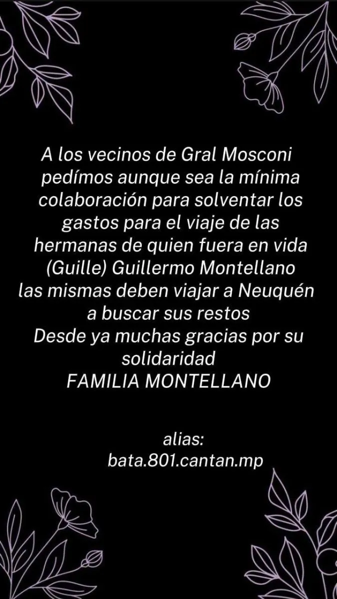 Desde su entorno difundieron un alias para quienes deseen colaborar: bata.801.cantan.mp, y explicaron que los costos del traslado superan las posibilidades económicas de la familia. “Se necesita colaboración, aunque sea mínima, para que sus hermanas puedan viajar y darle una despedida digna junto a los suyos”, señalaron.
