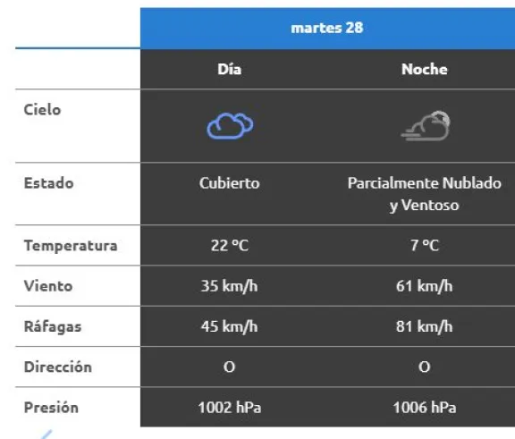 Para la ciudad de Neuquén, Cipolletti, Centenario y el resto del Alto Valle, se espera una máxima cercana a los 22°C, con viento del oeste de alrededor de 35 km/h durante el día y ráfagas que podrían alcanzar los 45 km/h. Sin embargo, el cambio más notorio llegará por la noche: el viento se intensificará con velocidades de hasta 61 km/h y ráfagas que podrían superar los 80 km/h, por lo que se recomienda precaución en rutas y actividades al aire libre.